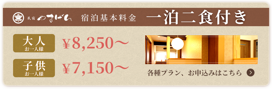 基本料金 1泊2食 大人8,800円(税込)~1泊2食 子供7,150円(税込)~ (すき焼き・BBQの場合+550円 / 鍋の場合+330円) 昼食料金 660円(税込)~※学校・団体様など人数に応じて料金の方はご相談いたします。 |
